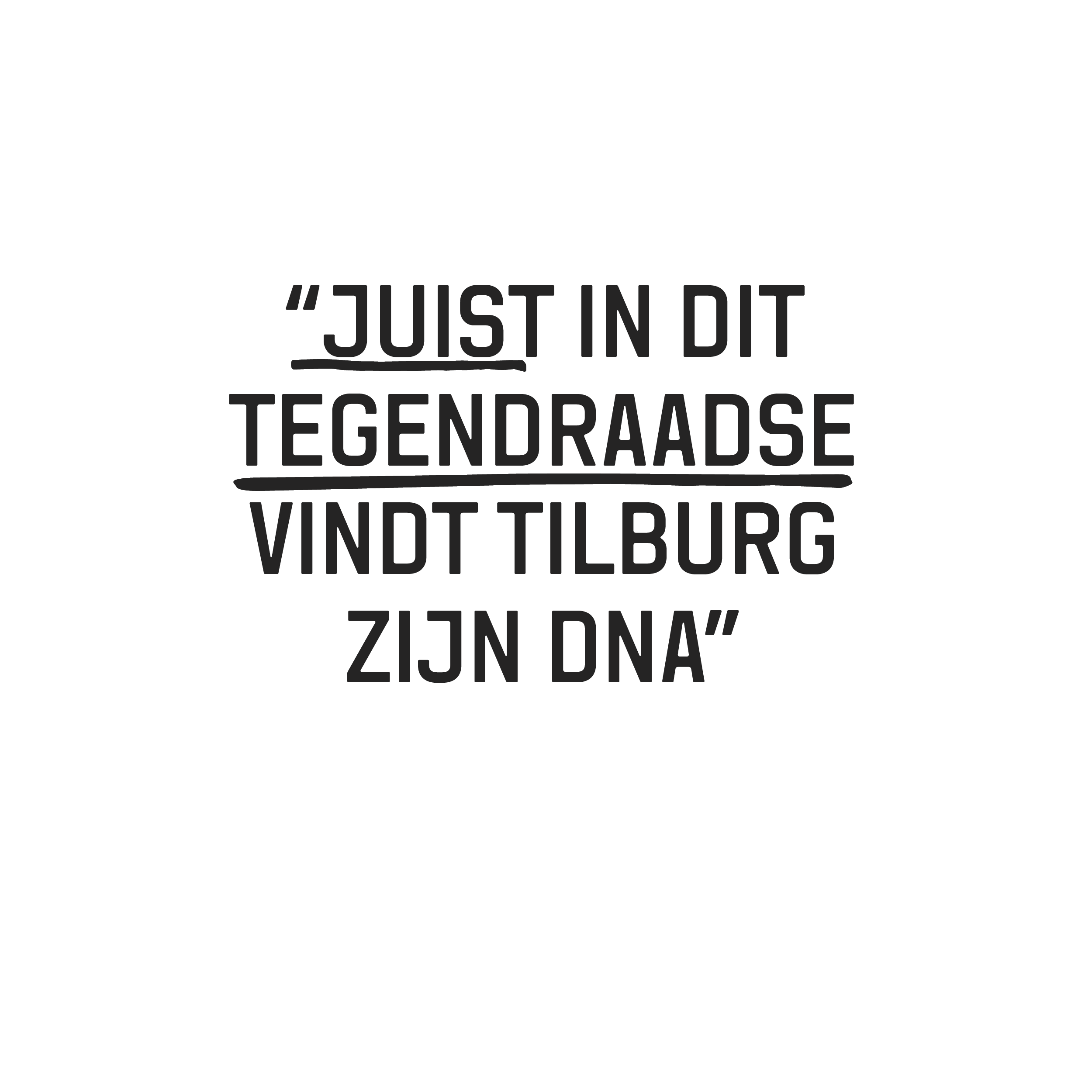 “Tilburg is een stad met de kwaliteiten van een dorp: veilig en vertrouwd. Het is een stad met veel kleur en (jong) talent waar bedrijvigheid en creativiteit voorop staat. Het Textielmuseum en museum de Pont zijn geliefd bij de inwoners. De stad heeft weinig oude bakstenen, maar blinkt uit in eigenzinnige en eigentijdse architectuur. Juist in dit tegendraadse vindt Tilburg zijn DNA.”